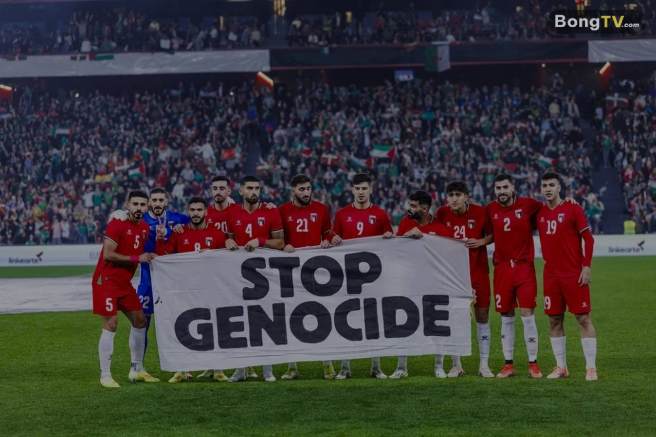 Những người tham gia trận đấu bóng đá Palestine đã mang theo biểu ngữ có nội dung Chấm dứt diệt chủng trước khi trận đấu bắt đầu