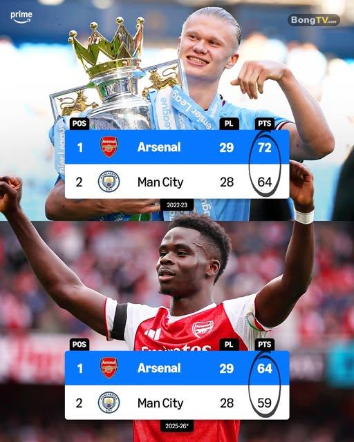 ✅ Arsenal hơn Man City 8 điểm sau 28 vòng đấu và đá nhiều hơn 1 trận