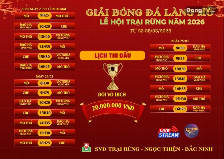 Lịch thi đấu / GIẢI BÓNG ĐÁ LÀNG MỖ LỄ HỘI TRUYỀN THỐNG THÔN TRẠI RỪNG NĂM 2026