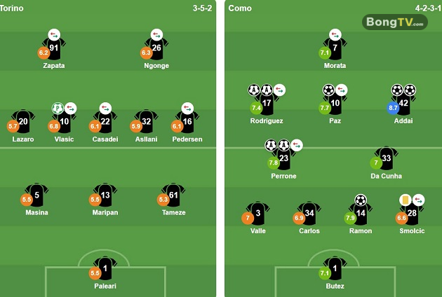 Trong thế trận mất kiểm soát, Torino tiếp tục để lộ khoảng trống. Nico Paz, người đang được Chelsea theo đuổi, tận dụng cơ hội để nâng tỷ số lên 4-1, trước khi Baturina hoàn tất chiến thắng 5-1 sau sai lầm mất bóng của Tameze. Với kết quả này, Como nối dài chuỗi trận bất bại lên con số mười và tạm thời vượt Juventus để vươn lên vị trí thứ sáu trên bảng xếp hạng.