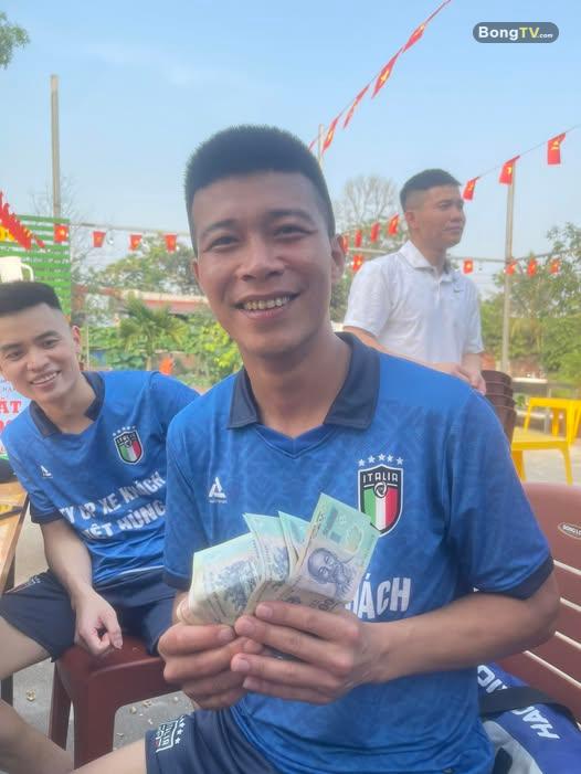 Đội trưởng Duẩn Tây ôm phần thưởng sau khi đưa Đồng Sau lên ngôi giải bóng đá Đại hội thể dục thể th