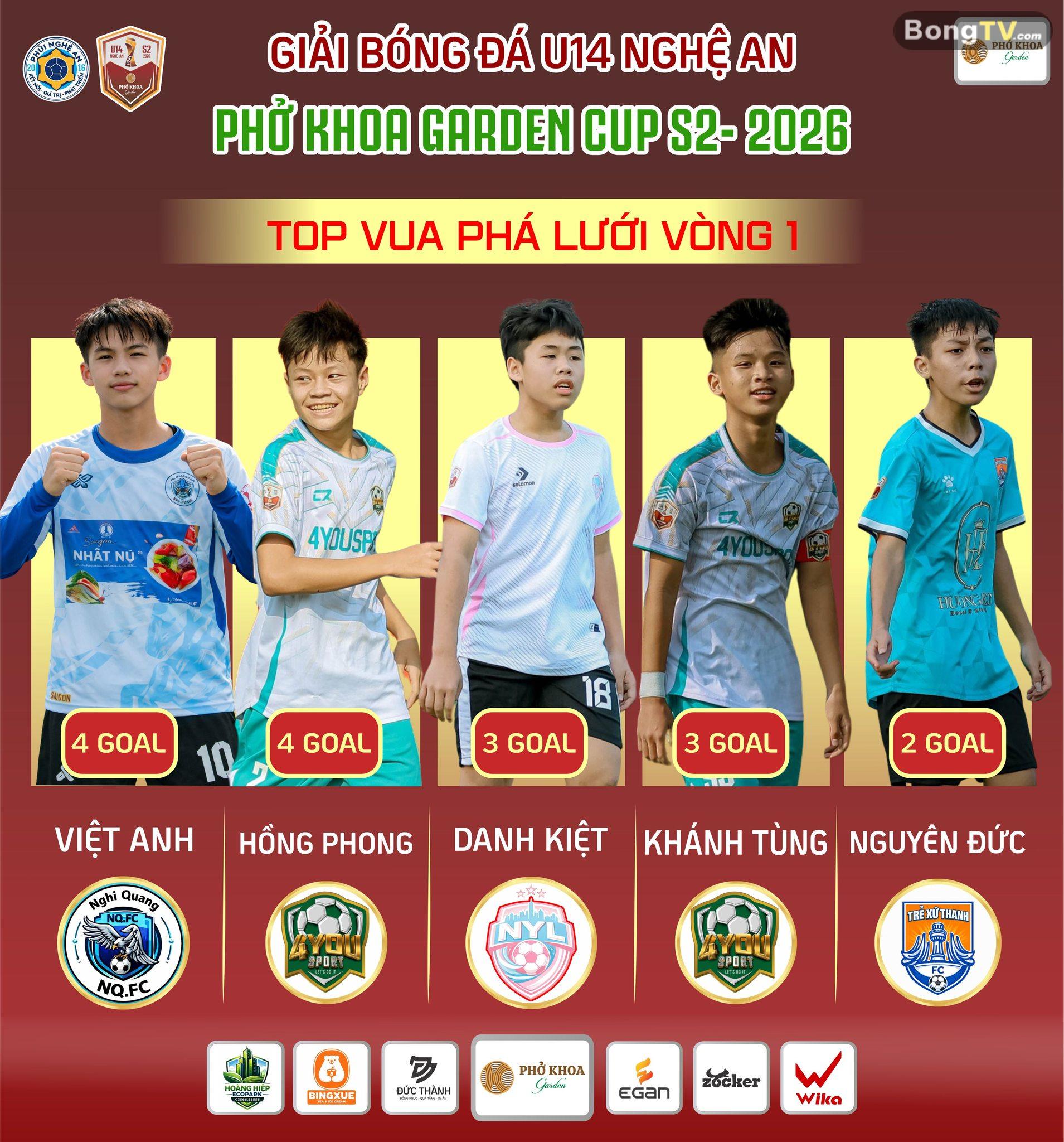 BXH Vua phá lưới sau vòng 1 Giải bóng đá U14 Nghệ An Phở Khoa Garden Cup 2026. 4yousport có đến 2 cá